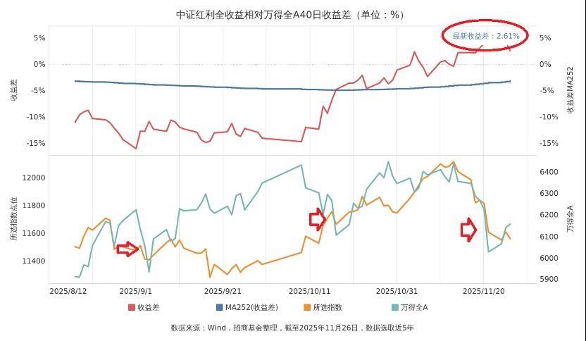 11月中旬以来,A 股市场整体延续回调震荡态势盈通策略,防御性较强的红利资产相对优势明显。截至11月26日,中证红利全收益相对万得全A40日收益差最新数值回升至2.61%,也侧面显示近期红利资产相对强势。