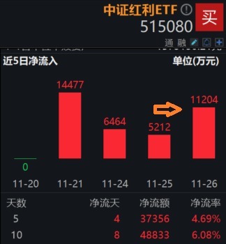 资金面方面看盈通策略,近期随着红利逆市走强,相关ETF“吸金力”也较为显著。以中证红利ETF(515080)为例,Wind金融终端数据显示,昨日该ETF获1.12亿元资金净流入,拉长看,近4日连续获资金净流入,累计3.74亿元。